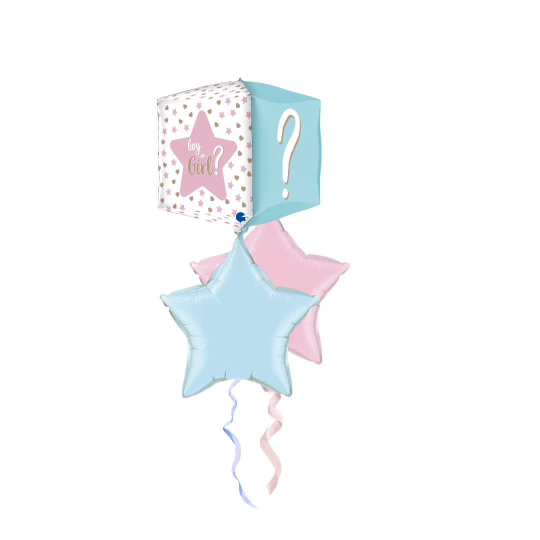 Includes Foil shape balloon boy or girl 38cm, blue star foil 45cm, pink star foil 45cm all helium filled on a balloon weight.