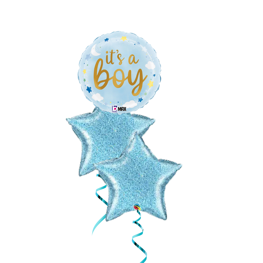 Includes Foil shape balloon its a boy 45cm, 2 x Blue Glitter stars foil balloons all helium filled on a balloon weight.