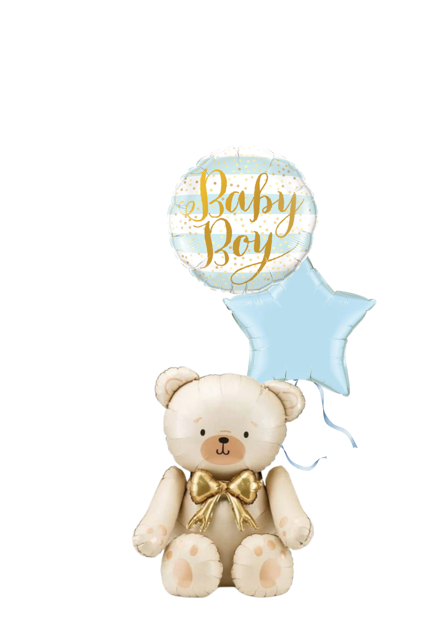 Includes 1 x Sitting Cream Bear 84cm Foil (Air Filled) and 1 x blue Star 45cm Foil Balloon, 1 x Baby Boy 45cm foil balloon all helium filled on a balloon weight.