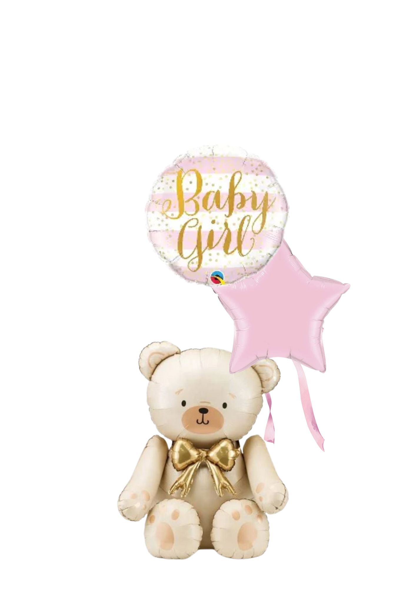 Includes 1 x Sitting Cream Bear 84cm Foil (Air Filled) and 1 x Pink Star 45cm Foil Balloon, 1 x Baby Girl 45cm foil balloon all helium filled on a balloon weight.