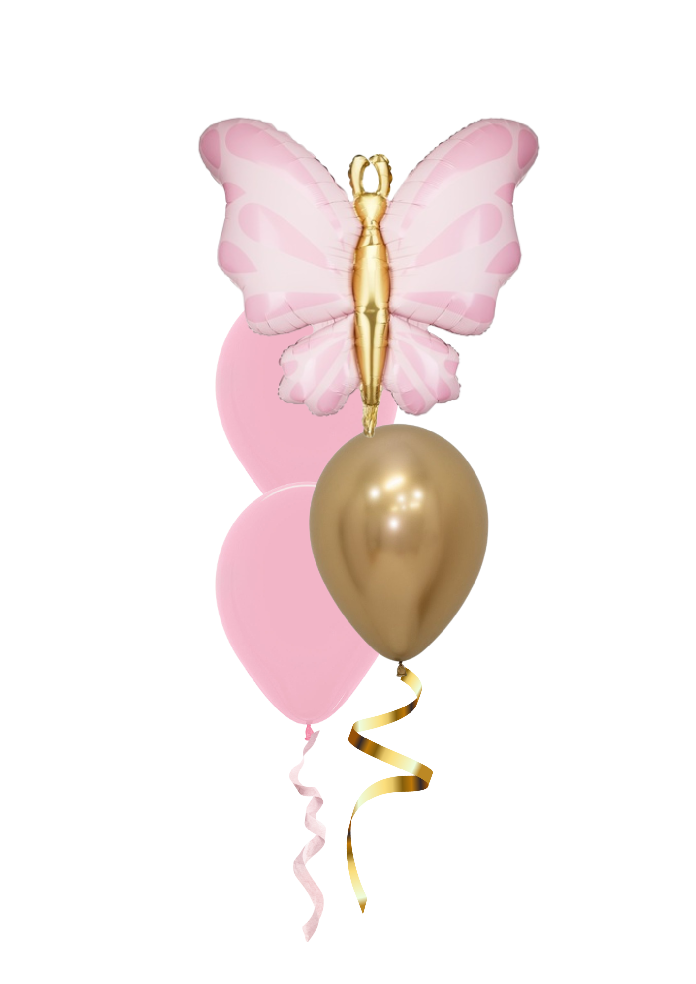 Includes 1 x Butterfly Pink 69cm Foil and 3 x latex helium filled balloons on a balloon weight.