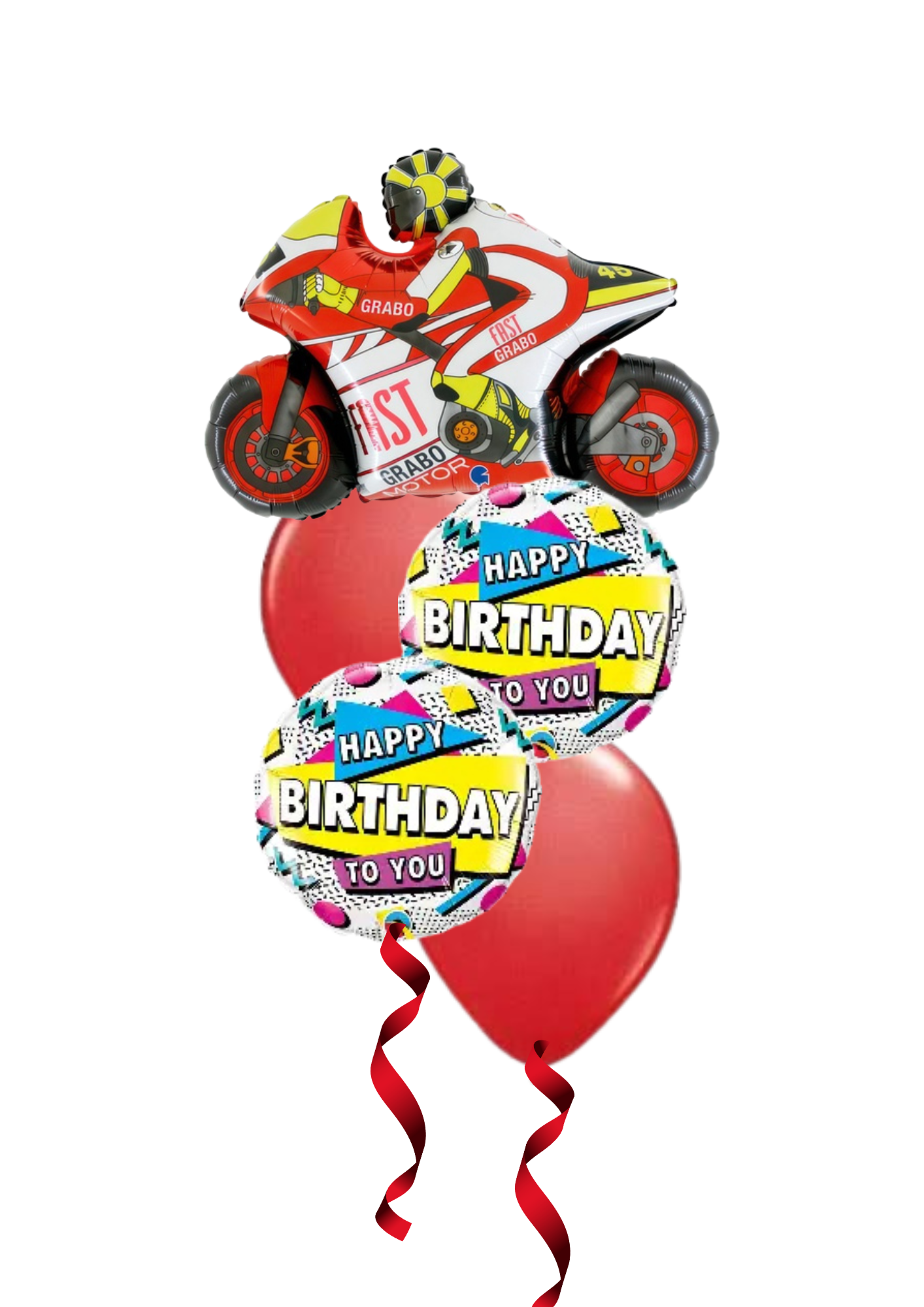 Includes 1x Motorbike 74cm, 2 x happy birthday to you foils 46cm and 2 latex Helium Filled balloons on Balloon weight