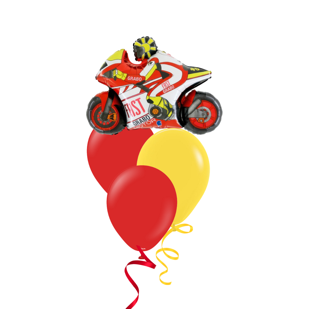Includes 1 x Motorbike Red foil balloon 74cm, 3 x latex balloons all helium filled on a balloon weight.