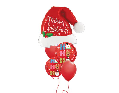 Includes Christmas Hat Foil, 2 x Ho Ho Ho Foil and 2 x latex balloons all helium filled on a balloon weight.