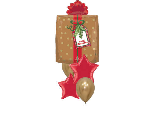 Includes 1 present foil 45cm, 2 Merry Christmas Foils 45cm and 2 Latex balloons all helium filled on a balloon weight.