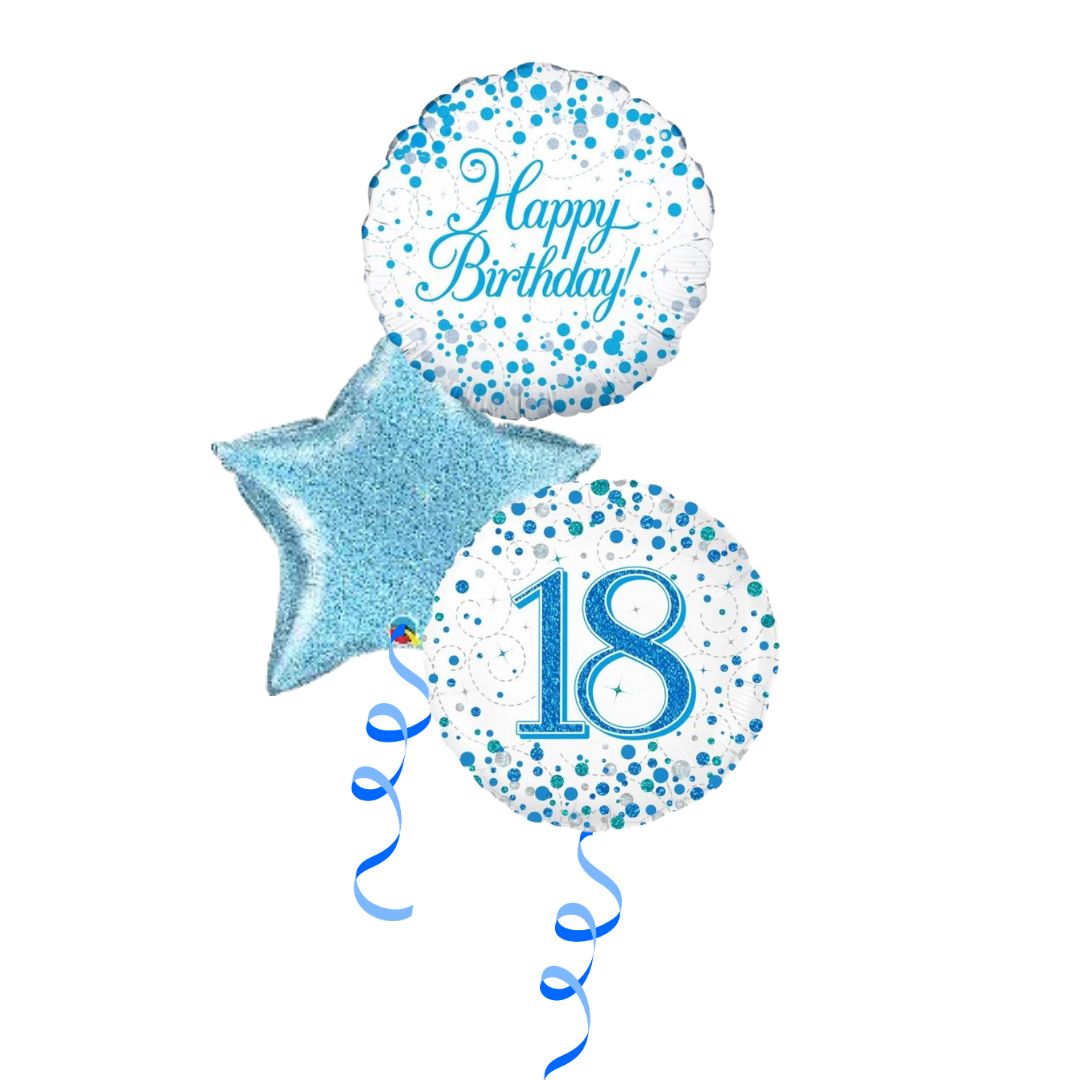 Includes 1 x happy birthday foil 45cm, 1 x 18 birthday foil 45cm, 1 x Blue glitter star 51cm all helium filled on a balloon.