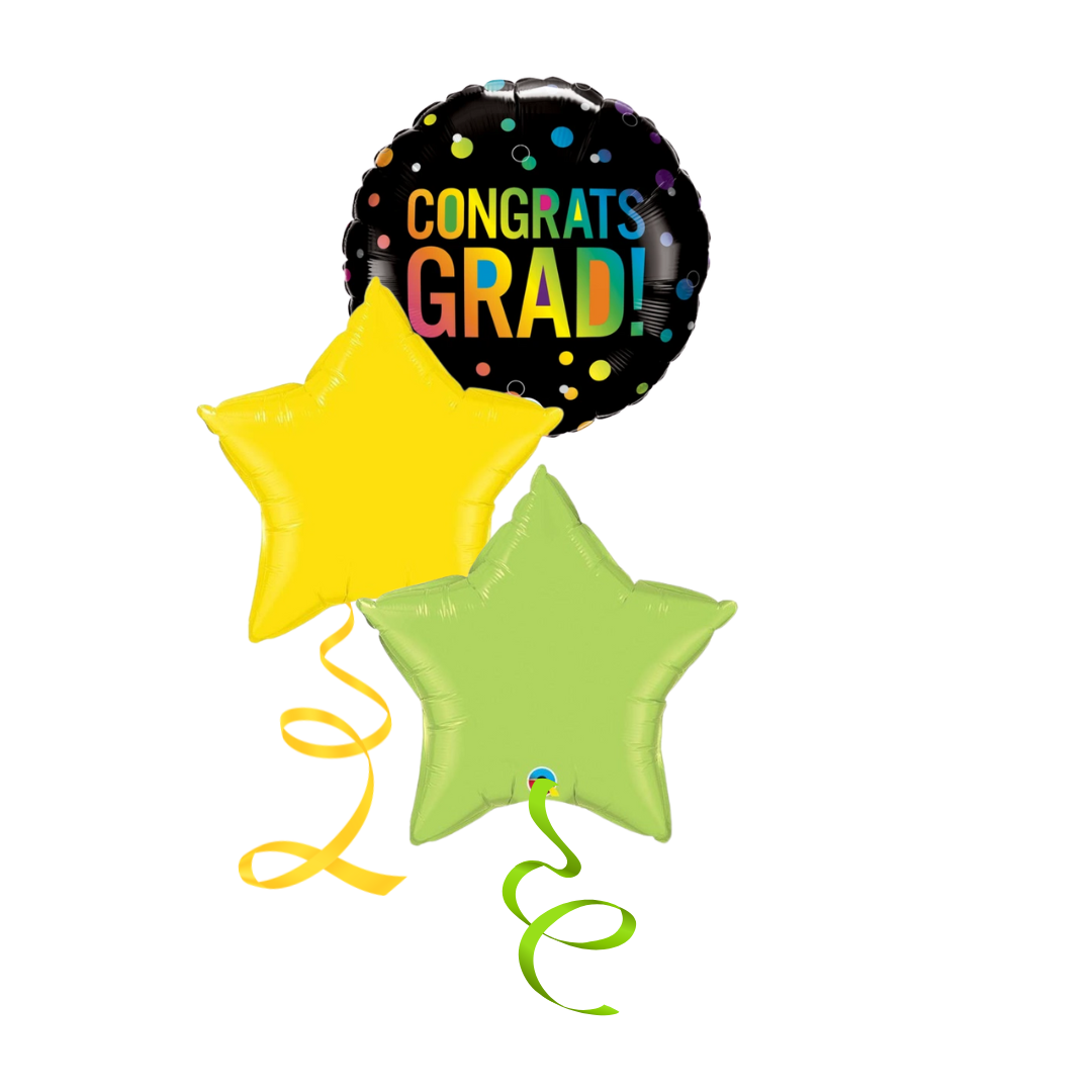 Includes Foil shape balloon Congrats Grad 45cm, 2 x star foil balloons all helium filled on a balloon weight.
