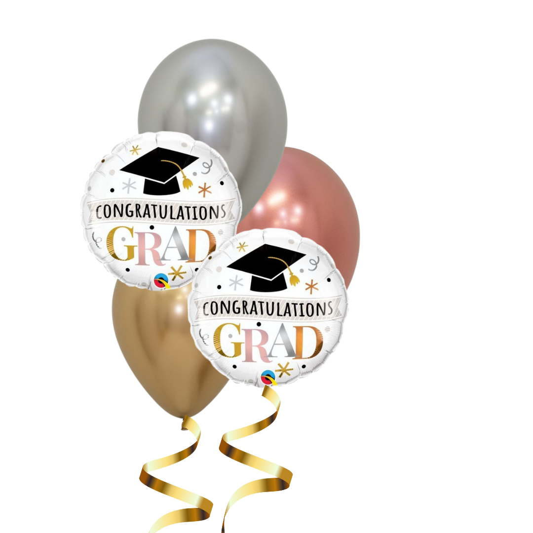 Includes 2 x 45cm Congratulations grad balloons, 3 x latex balloons all helium filled on a balloon weight.