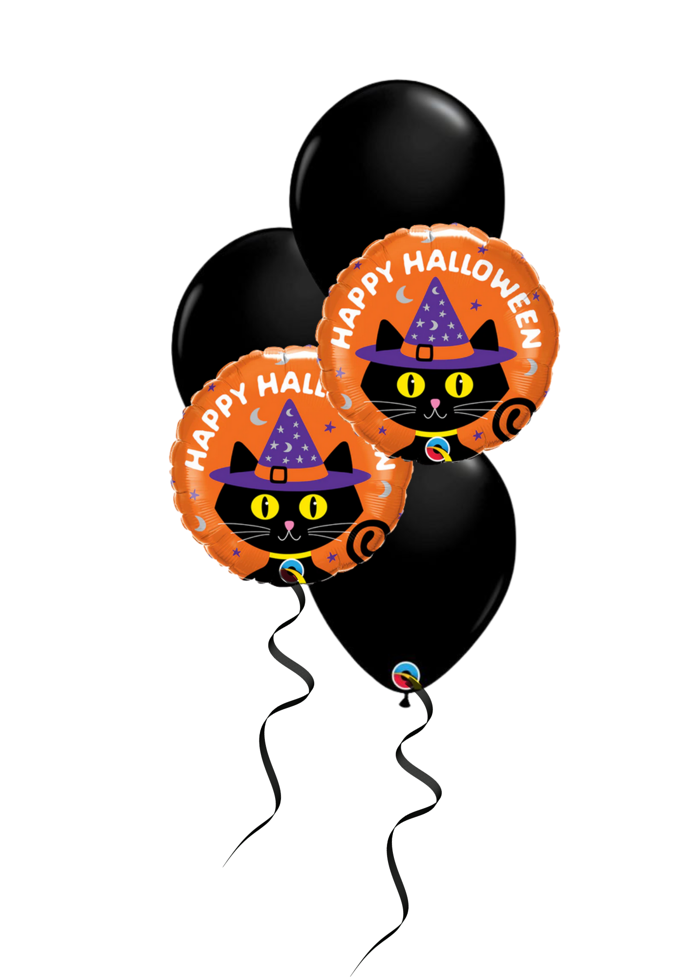 Includes 2 x Halloween Black Cat & Hat foils 45cm and 3 x latex helium filled balloons on a balloon weight.