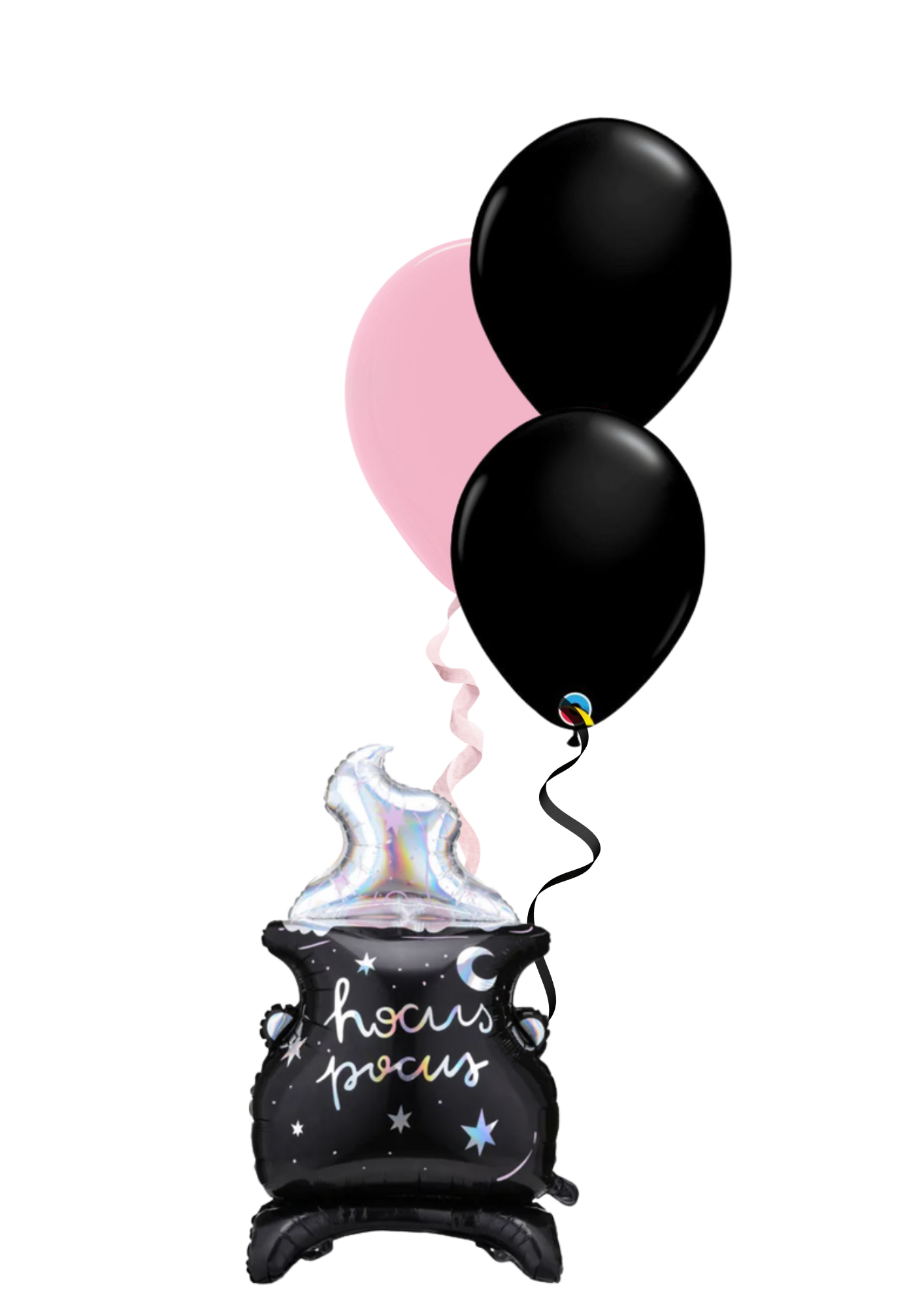 Includes 1 x Standing Cauldron 80cm Foil and 3 x latex helium filled balloons on a balloon weight.