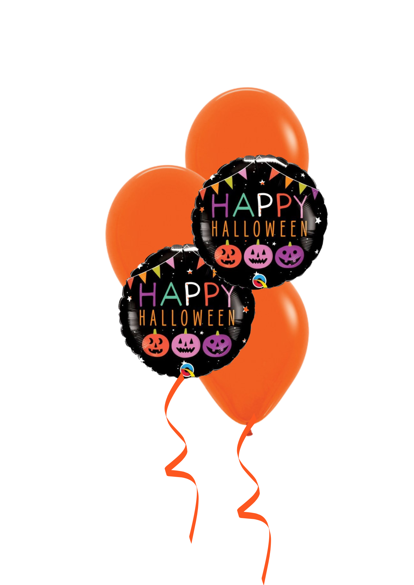 Includes 2 x Halloween Pumpkin & banners foils 45cm and 3 x latex helium filled balloons on a balloon weight.