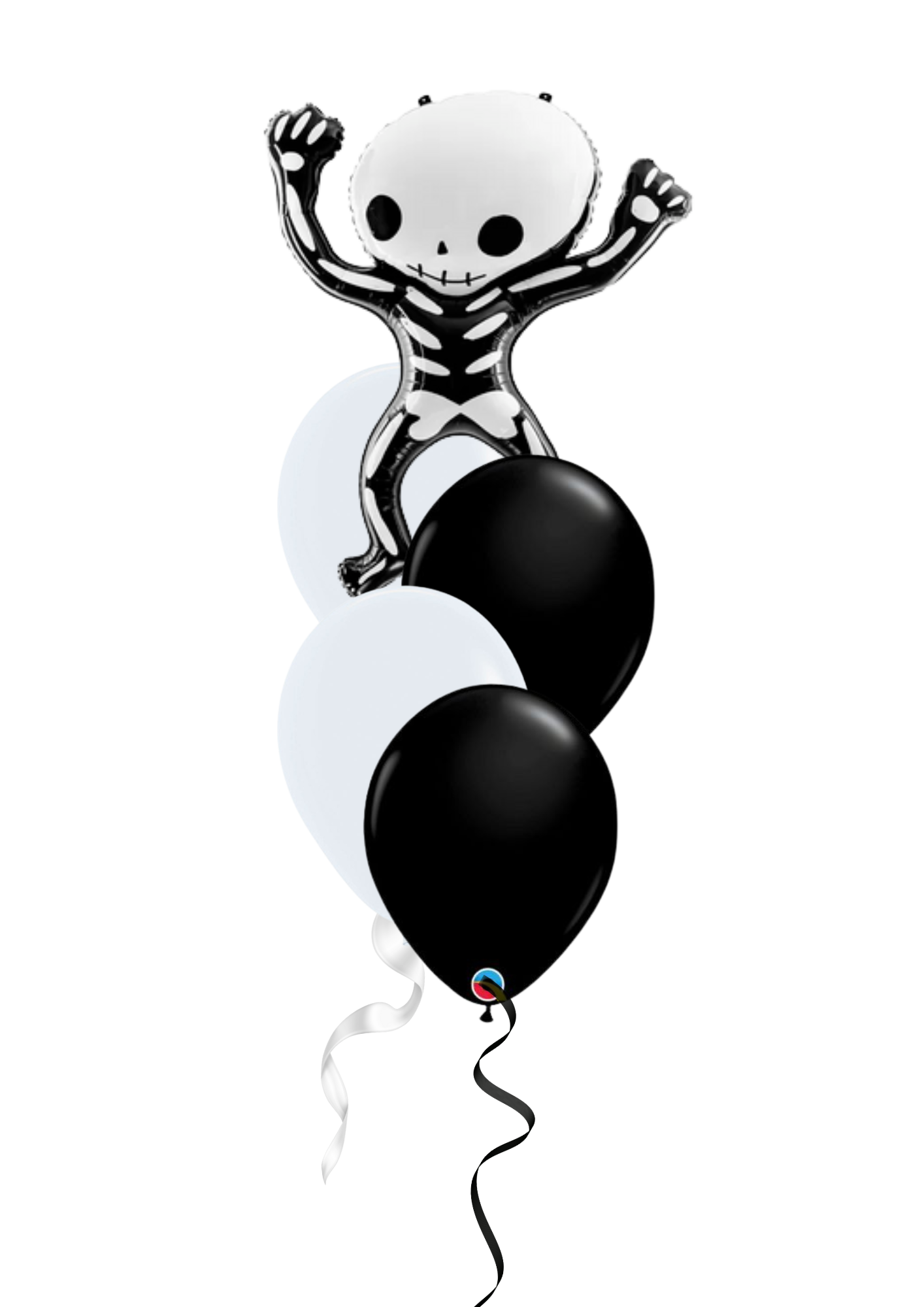 Includes 1 x Skeleton 100cm Foil and 4 x latex helium filled balloons on a balloon weight.