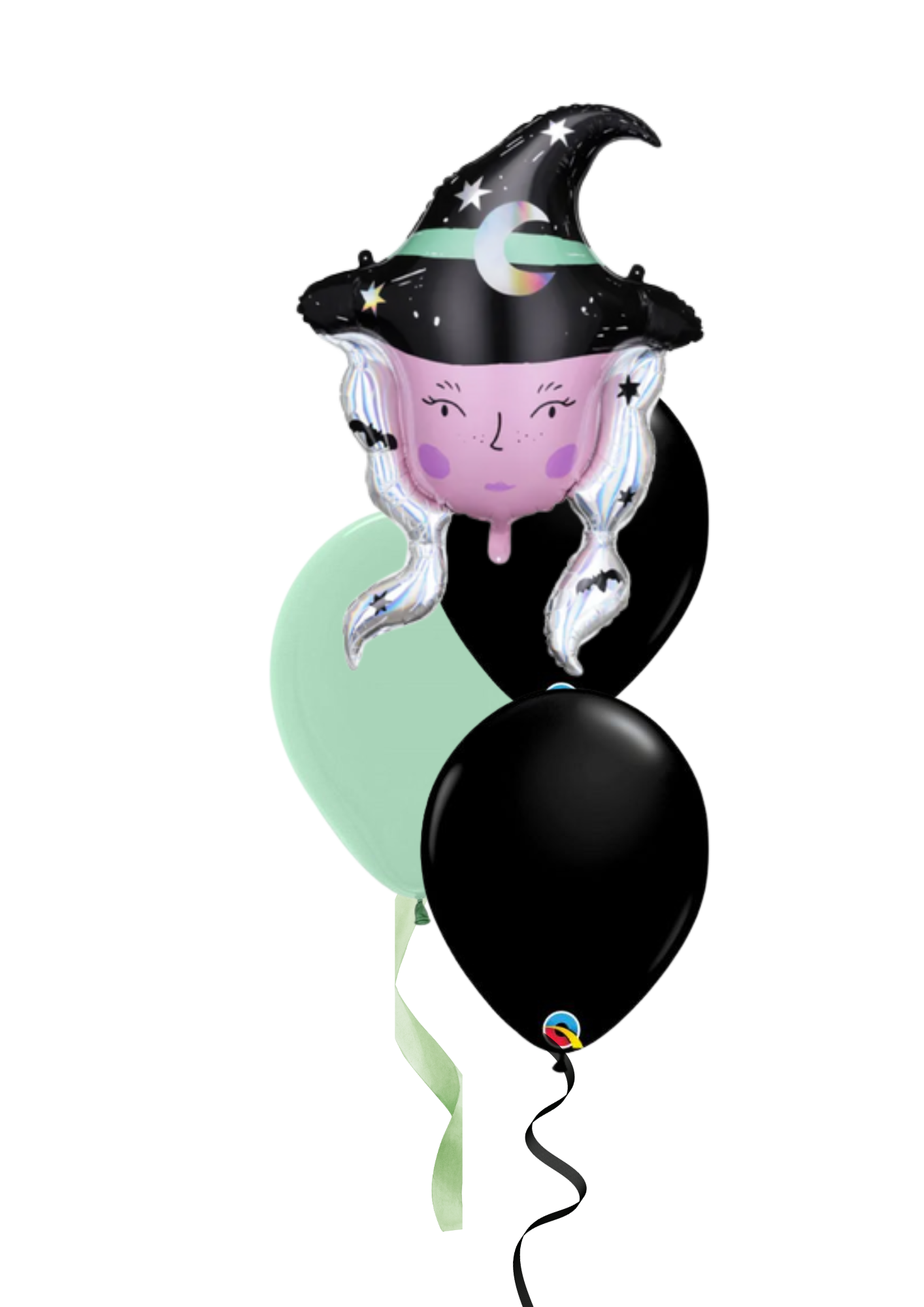 Includes 1 x Witch 86cm Foil and 3 x latex helium filled balloons on a balloon weight.