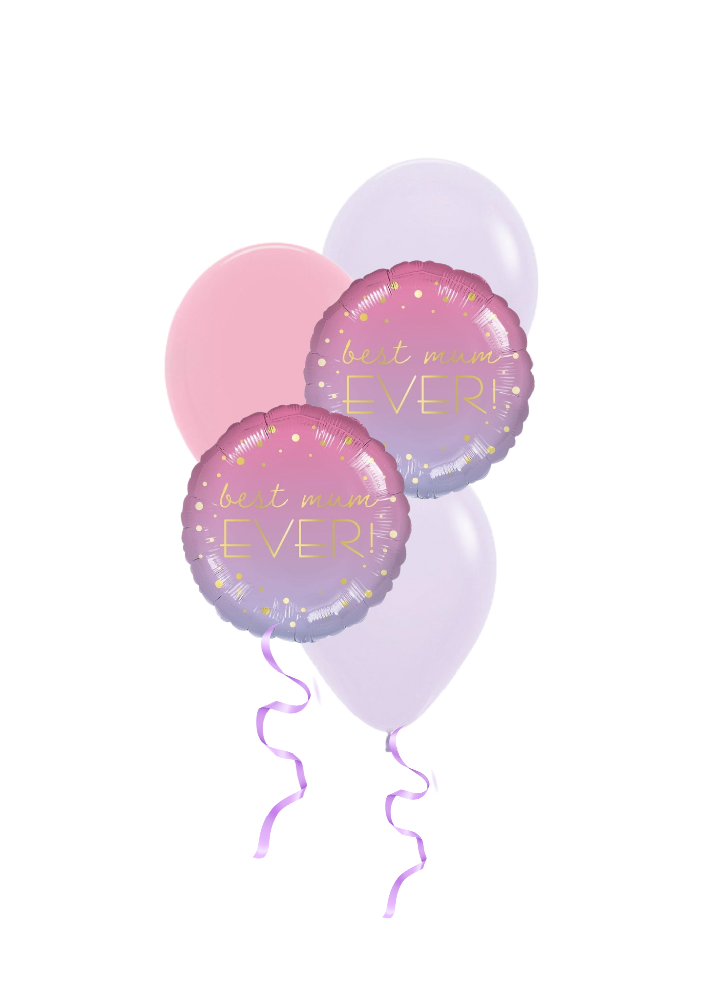 Includes 2 x 45cm Best Mum Ever foil balloons, 3 x latex balloons all helium filled balloons on a weight