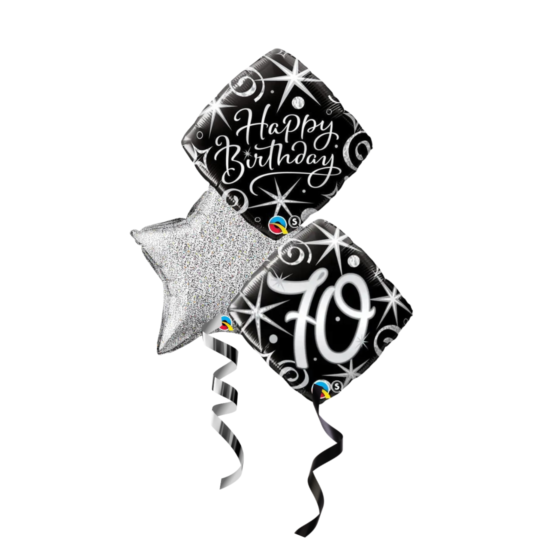 Includes 1 x happy birthday foil 45cm, 1 x 70 birthday foil 45cm, 1 x Silver glitter star 51cm all helium filled on a balloon.