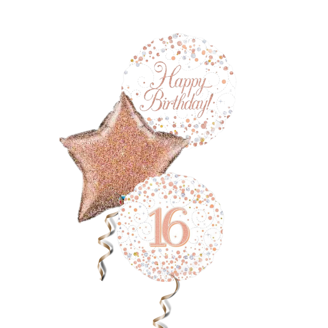 Includes 1 x happy birthday foil 45cm, 1 x 16 birthday foil 45cm, 1 x Blue glitter star 51cm all helium filled on a balloon.