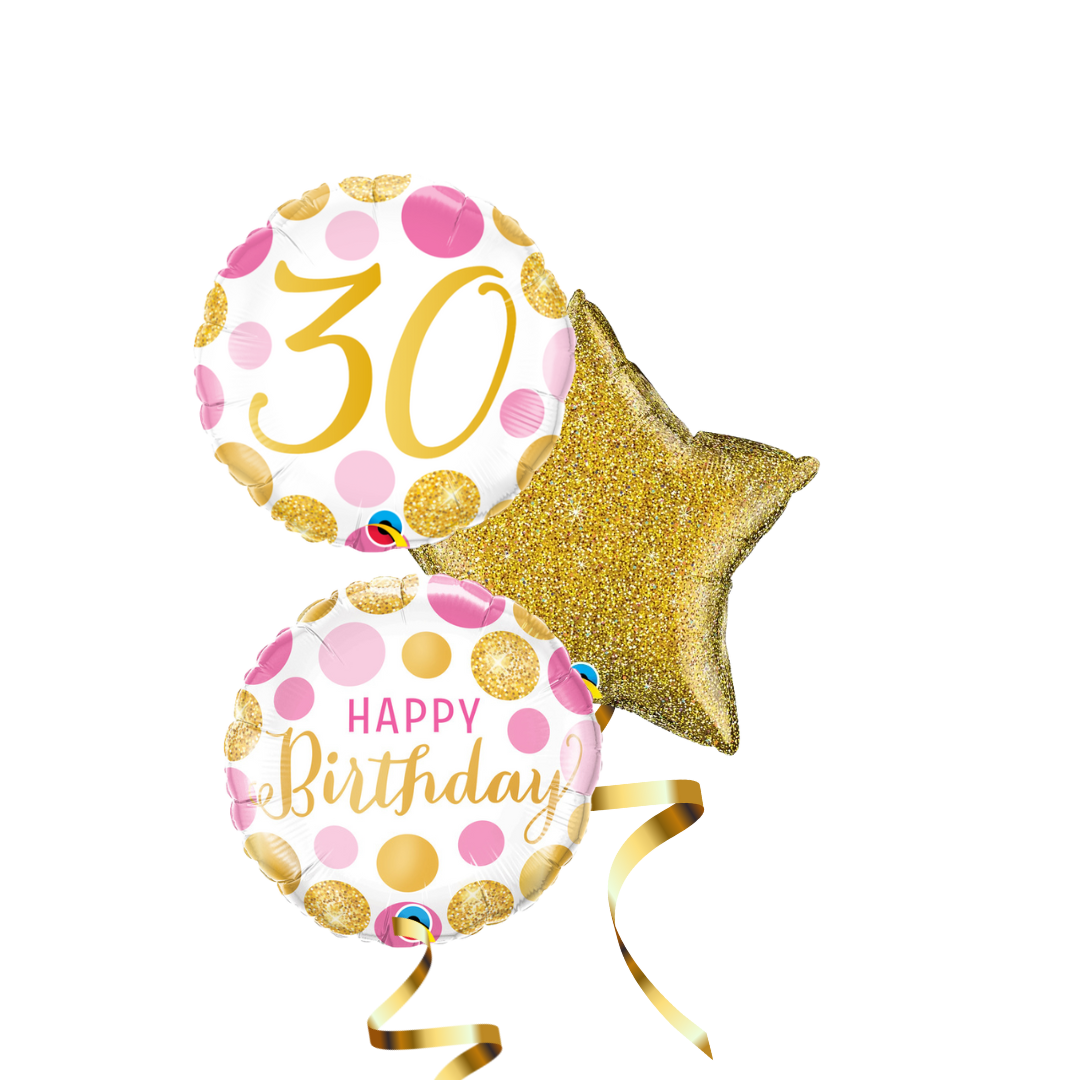 Includes 1 x happy birthday foil 45cm, 1 x 30 birthday foil 45cm, 1 x Gold glitter star 51cm all helium filled on a balloon.