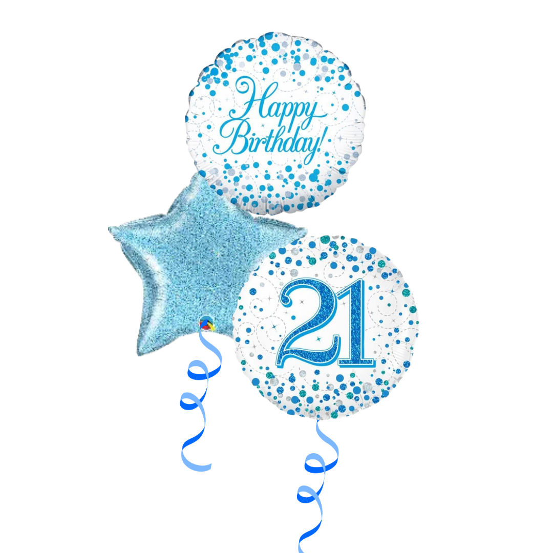 Includes 1 x happy birthday foil 45cm, 1 x 21 birthday foil 45cm, 1 x Blue glitter star 51cm all helium filled on a balloon.